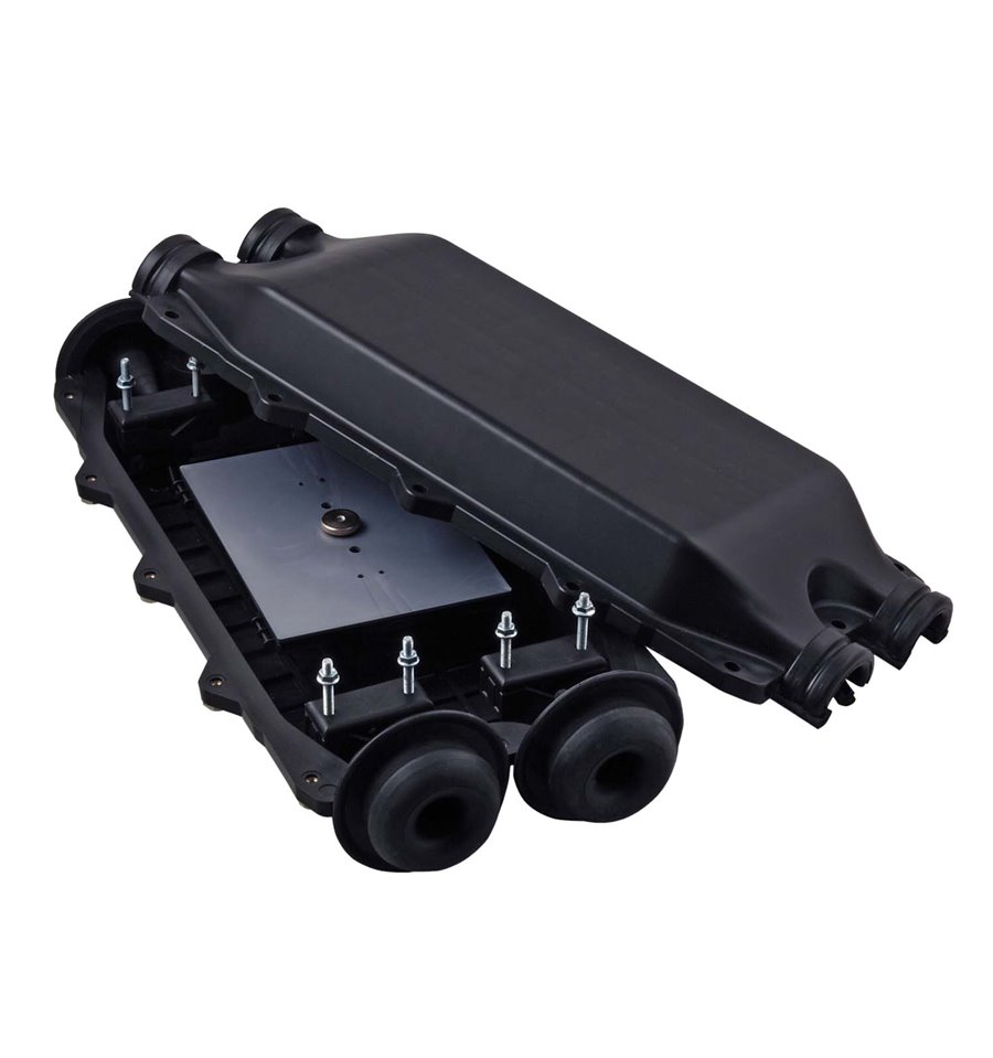 Si tratta di una scatola di distribuzione meccanica per cavi in fibra, costituita da 2 semi-gusci in gran parte simmetrici che rappresentano il corpo della scatola. Il semi-guscio superiore contiene una guarnizione in gomma per tutta la lunghezza della scatola. Il design a forma di fungo è stato studiato appositamente. La pressione tra i due semi-gusci garantisce l’impermeabilità. La parte superiore e quella inferiore sono avvitate insieme da viti e dadi inossidabili. I dadi sono fissati nella parte inferiore del semi-guscio. Un fermacavo è presente in prossimità del foro d’entrata del cavo nella parte inferiore della scatola. I gommini di entrata sono in gomma e sono conici, così è possibile coprire un’ampia gamma di diametri di cavo. Dopo la giunzione i semi-gusci vengono avvitati insieme. Quindi i passacavi devo essere rovesciati indietro sopra le entrate della scatola e dopo fissati con fascette inox.