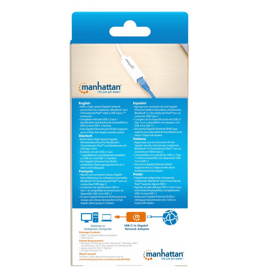 - Aggiunge una connessione di rete Gigabit ad alta velocità per notebook, MacBook® e Chromebook Pixel™ con un connettore USB-C™
