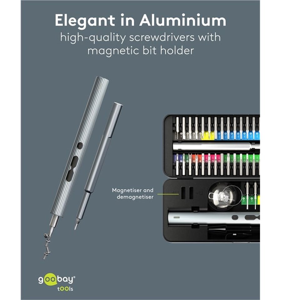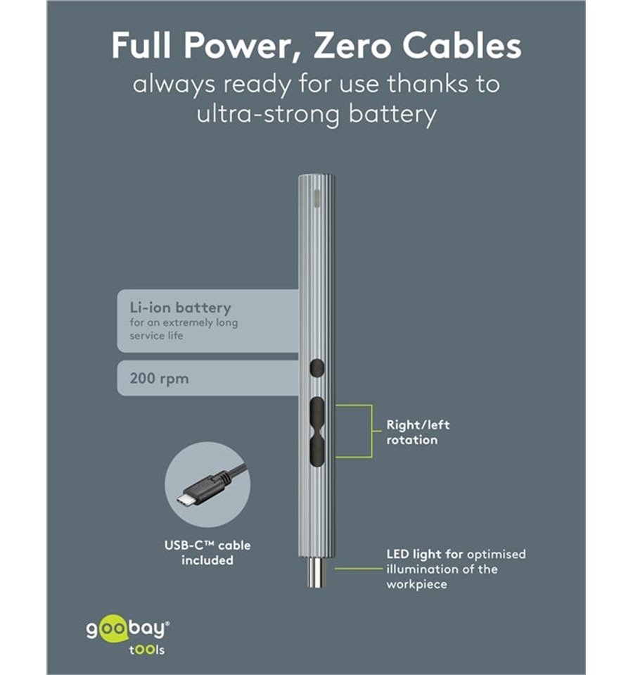Goobay propone inoltre batterie ricaricabili, caricatori e alimentatori per rispondere alle esigenze di alimentazione non solo dell’utente di computer ma anche dei possessori di apparecchiature digitali e multimediali portatili (per esempio cavi e accessori per iPod, iPhone, iPad e numerosi altri modelli di telefonini).