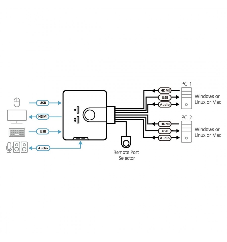 - Lunghezza del cavo: KVM 2 da 1,2m; Selettore remoto della porta 1,8m