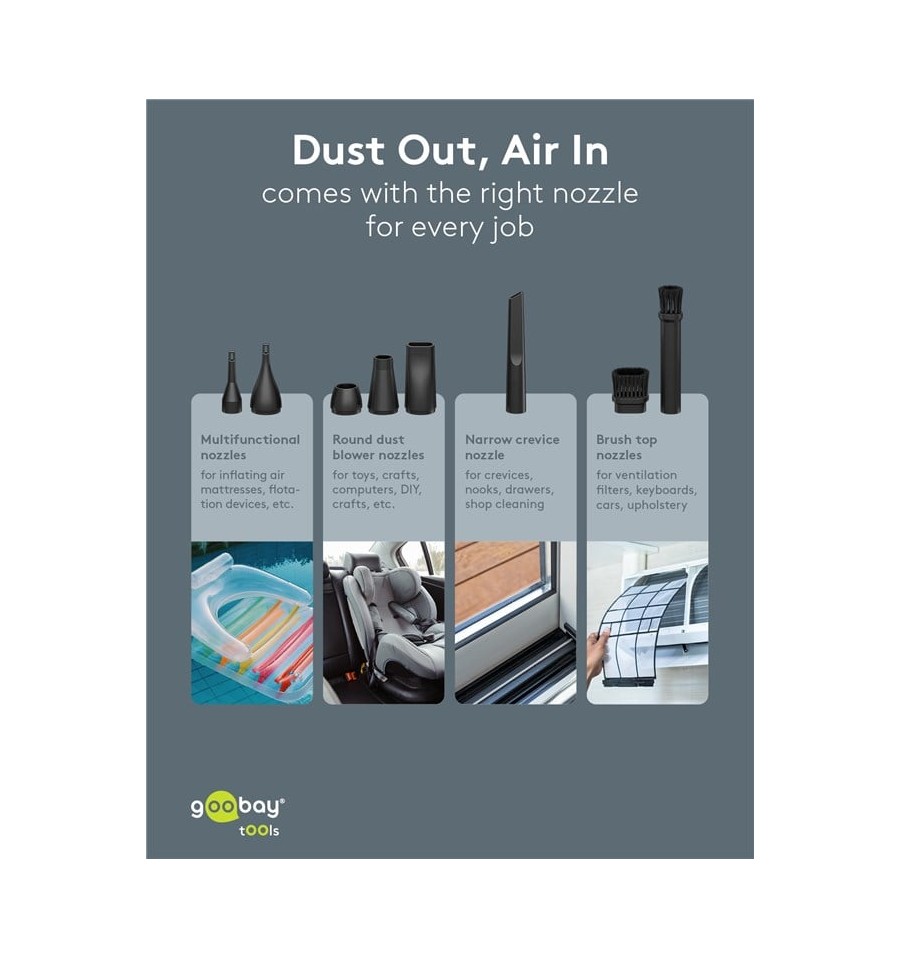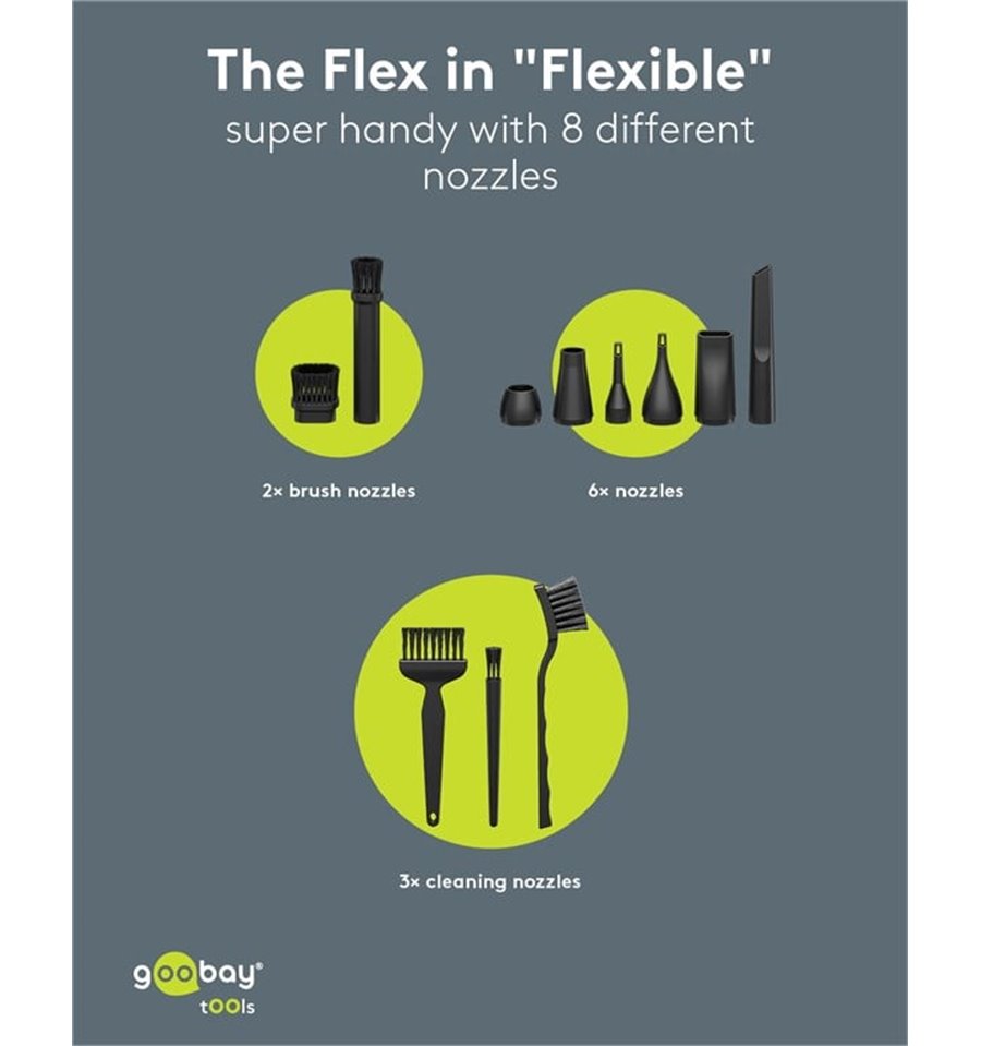 Goobay propone inoltre batterie ricaricabili, caricatori e alimentatori per rispondere alle esigenze di alimentazione non solo dell’utente di computer ma anche dei possessori di apparecchiature digitali e multimediali portatili (per esempio cavi e accessori per iPod, iPhone, iPad e numerosi altri modelli di telefonini).