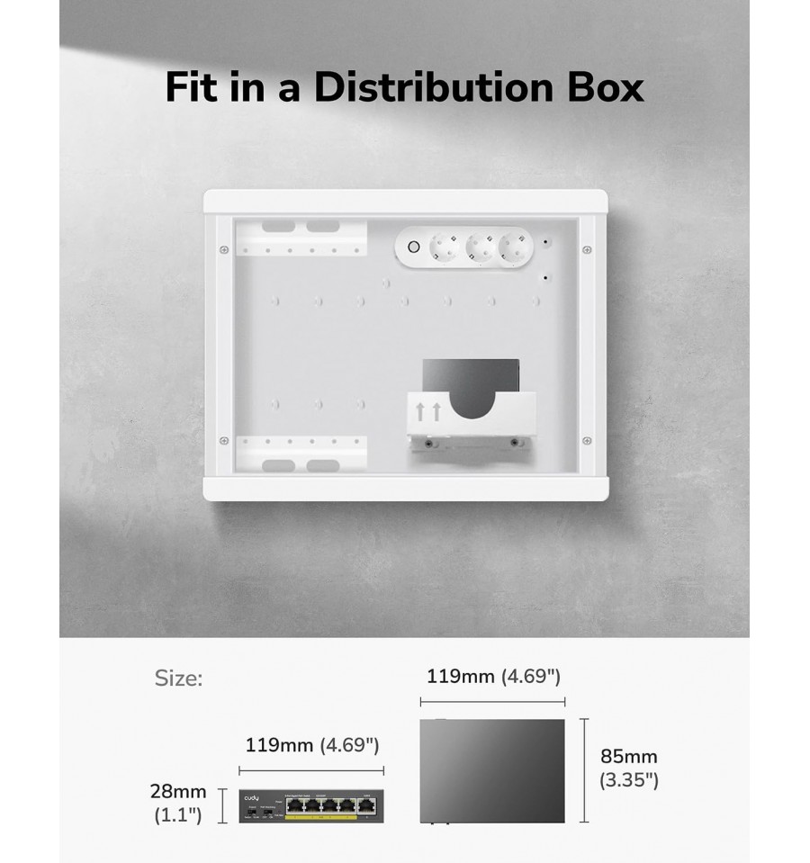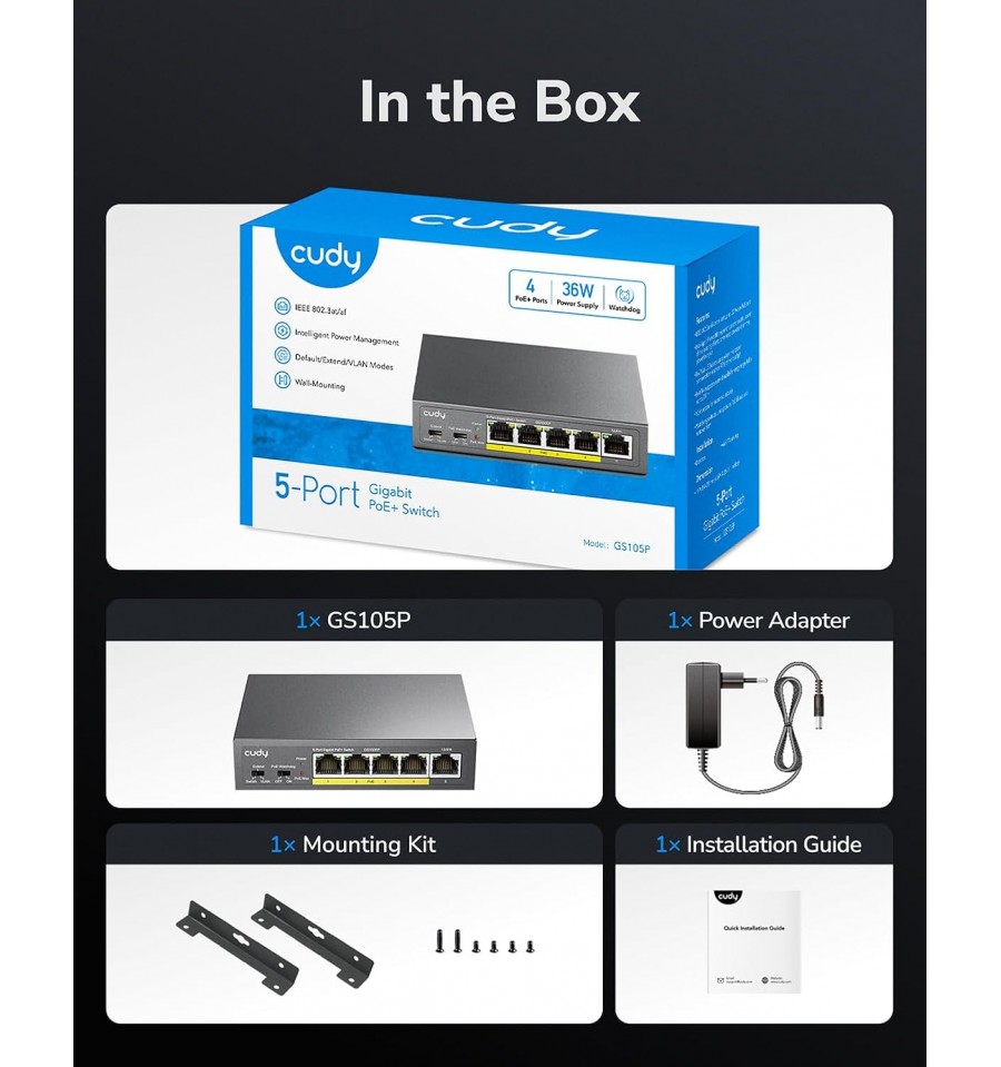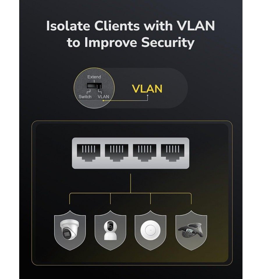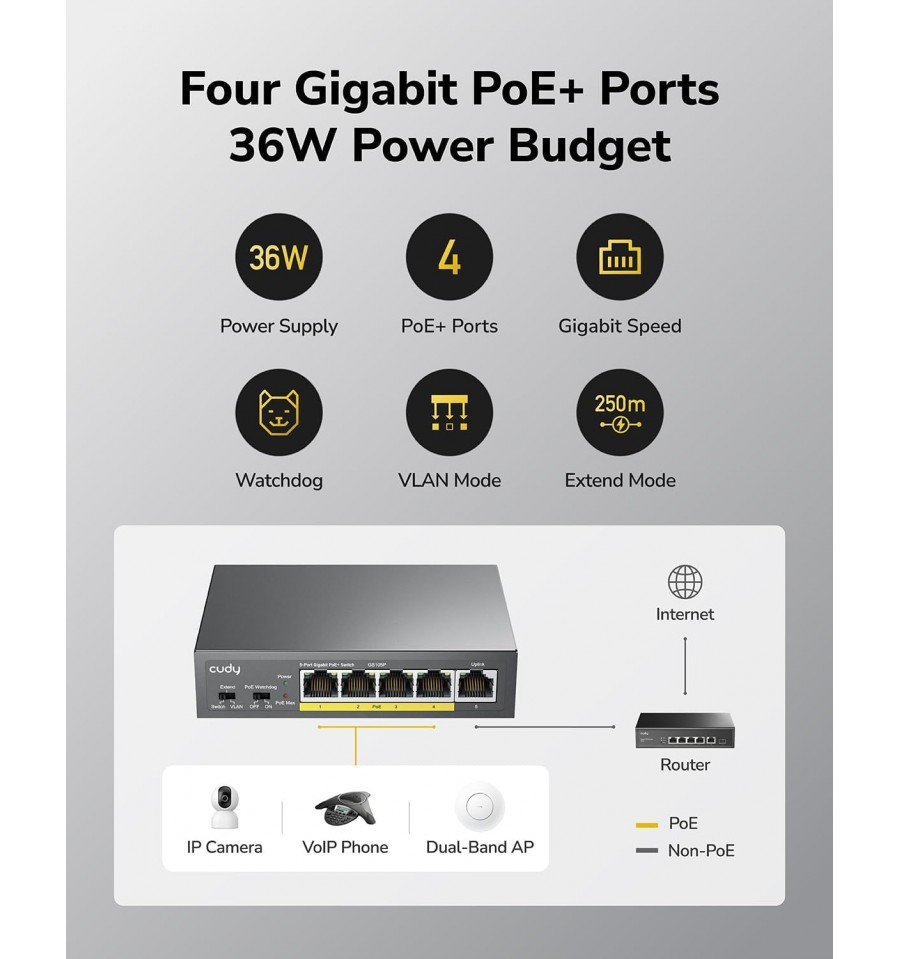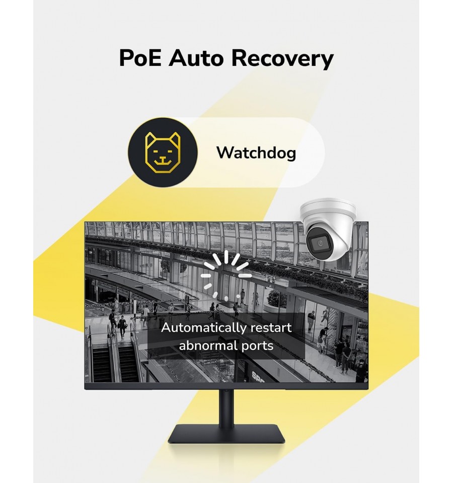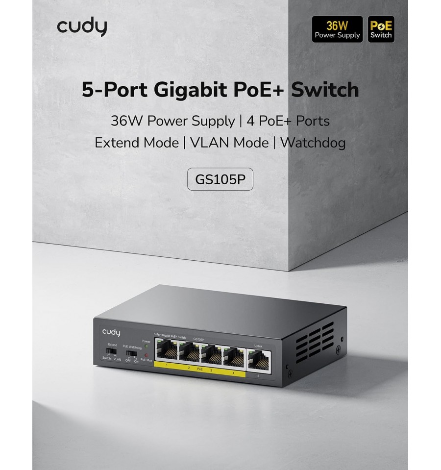 Switch PoE da parete con alimentatore da 36W e sistema di raffreddamento silenzioso, dotato di interruttore per la modalità predefinita/estesa/VLAN e interruttore di attivazione/disattivazione Watchdog.